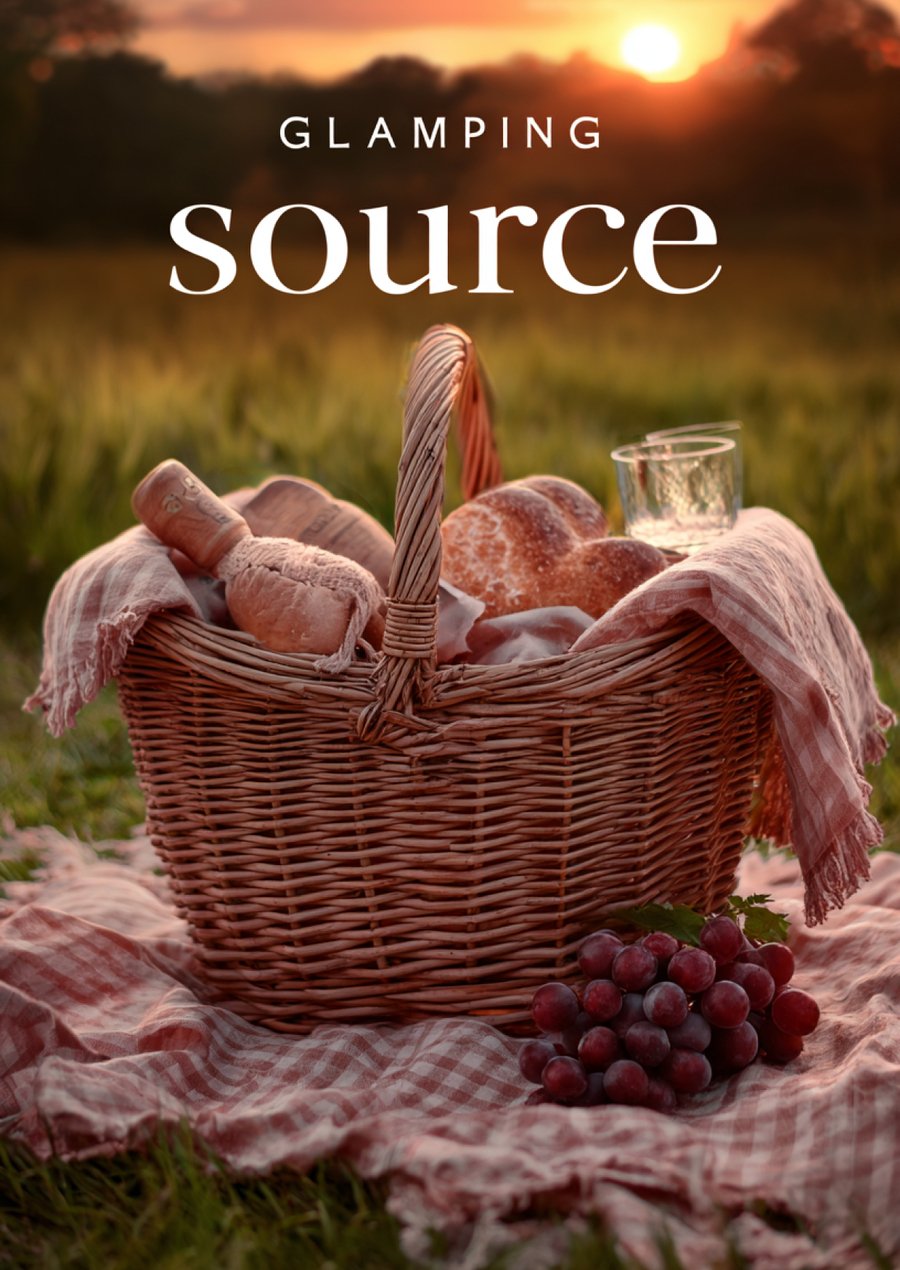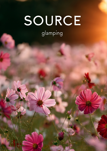 пример промпта одного из плакатов: Genrate a poster for glamping «Source» with vast, serene meadow at magic hour, soft focus, wildflowers (cosmos, daisies, poppies) swaying gently in the breeze, ethereal mist, warm glowing light, dreamy and peaceful, loopable video background.add the word «source» to the poster in large font. in a smaller font, add «glamping.» also add a wireframe layout.