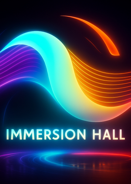 Промт для генерации логотипа: «Logo for Immersion Hall, inspired by synesthesia — when sound becomes color and light. Create a glowing, dynamic design that feels alive: morphing gradients, fluid lines, wave-like motion. The logo should feel like it’s breathing, pulsing with rhythm. Use bright neon gradients (turquoise, violet, amber, hot pink) on a dark background. Combine organic forms with clean geometry. The result should evoke emotion, energy, and deep sensory connection — a visual sound.»