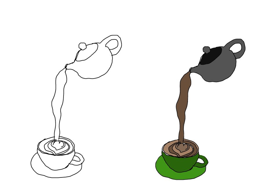 Игра с формами — поскольку просто стакан это примитивно и банально, было принято решение воссоздать чайник, который проливал бы содержимое либо в чашку, либо на пол.