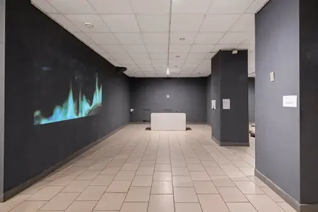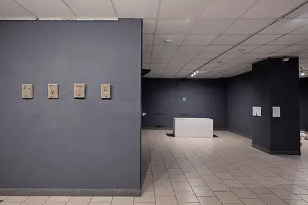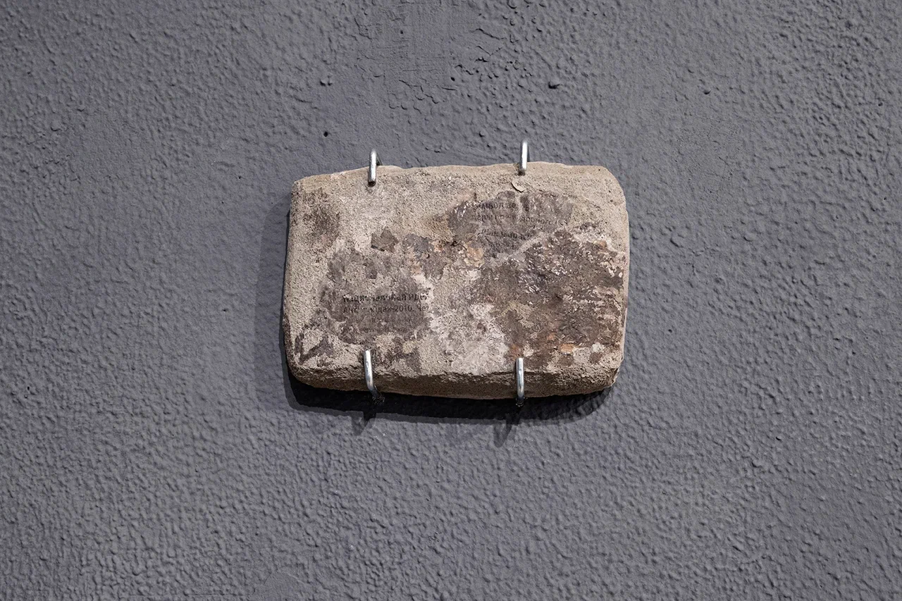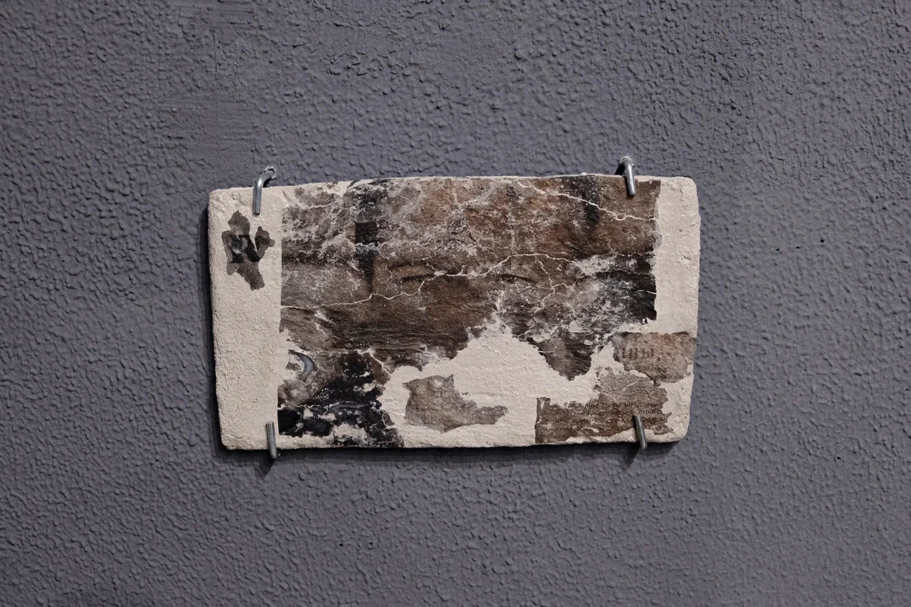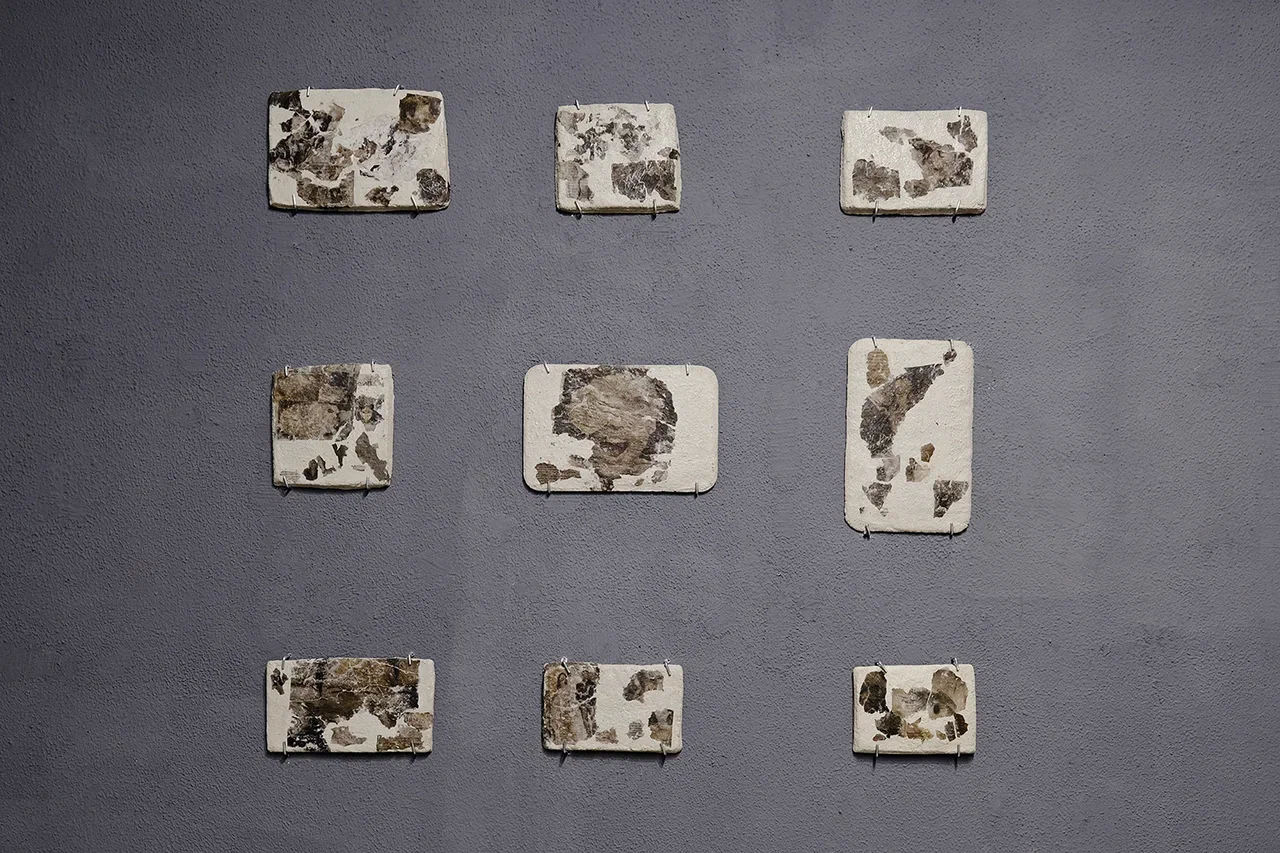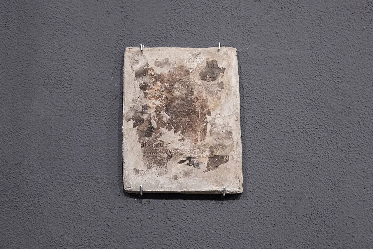 1. Серый зал как пространство интерпретаций воспоминаний, ускользания моментов памяти и способов удержать утрачиваемые фрагменты. Зал наполнен проектами видеоарта и работами выполненными из бетона с запечатанными в него обрывками пепла переработанных огнем глянцевых журнальных страниц, газетными вырезками, книгами и предметами — артефактами человеческого бытования, найденными в земле.