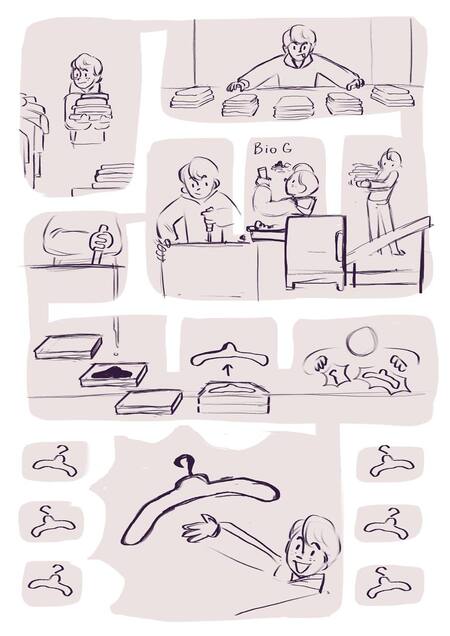 Заказ на комикс-плакат про разработку и изготовление вешалок из переработанного текстиля.