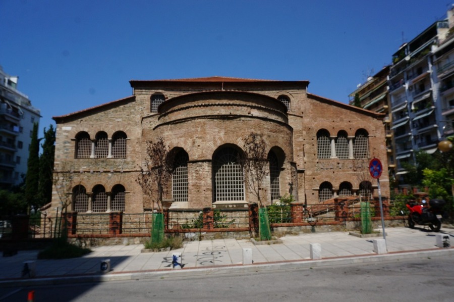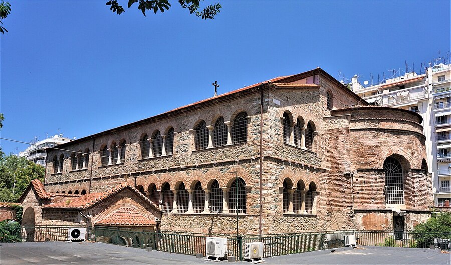 Базилика Ахиропиитос в Салониках, Греция (ок. 450-470 гг.) — вид спереди и сбоку