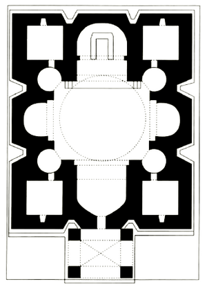 - Купол на барабане расположен в центре здания и опирается на четыре столба. - Просторанство внутри чётко образует форму креста, «рукава» которого видны в плане. - Угловые ячейки между «рукавами» креста дополняют основной объём.
