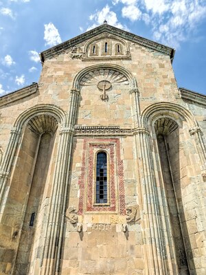 Собор Светицховели в Мцхете (XI в.) — выдающийся памятник грузинского средневекового зодчества, построенный по крестово-купольной схеме. Его отличает удлинённый план, где подкупольный квадрат смещён к востоку, а мощный барабан с коническим куполом доминирует над композицией. Фасады украшены изящной резьбой по камню, а интерьер сохранил фрагменты фресок. Собор служил главным духовным центром Грузии и местом коронации и погребения царей.