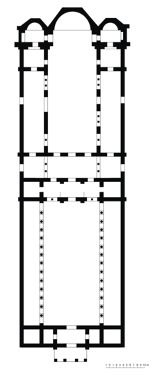 - План: Прямоугольный, с чёткой ориентацией с запада на восток. - Нефы: 3 или 5, реже 1. Центральный неф всегда выше и шире боковых. - Освещение: Верхний ярус центрального нефа имеет окна, которые являются главным источником света. - Апсида: Полукруглый или многоугольный выступ в восточной части, где расположен алтарь.