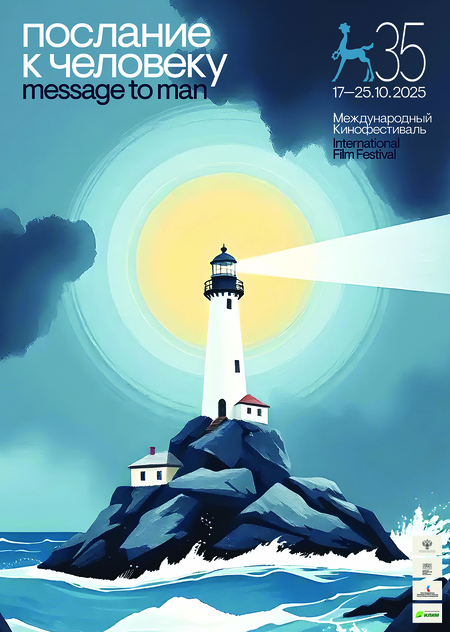 Ночь. Бушующее море бьётся о скалы. На утёсе — маяк. Каждый оборот линзы, каждая вспышка — как кадр: свет ритмично режет туман и даёт надежду тем, кто идёт сквозь тьму. За 35 лет этот луч уже указал путь многим зрителям и авторам со всего мира. Фигура маяка выступает в качестве философского образа — шторм не утихнет по нашей воле, но в наших силах помочь не потерять направление. Этот плакат о миссии фестиваля: посылать свой свет в темноту, даже не ожидая ответа, и верить, что где-то он будет замечен и станет чьей то опорой. Смысл Послания к Человеку: держи курс, делись светом и пусть твоя история освещает путь другим.