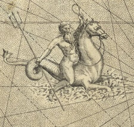 «Новое и расширенное описание мира, приспособленное для использования мореплавателями» Карта мира Меркатора, детали морской монстр и Посейдон 1569 год
