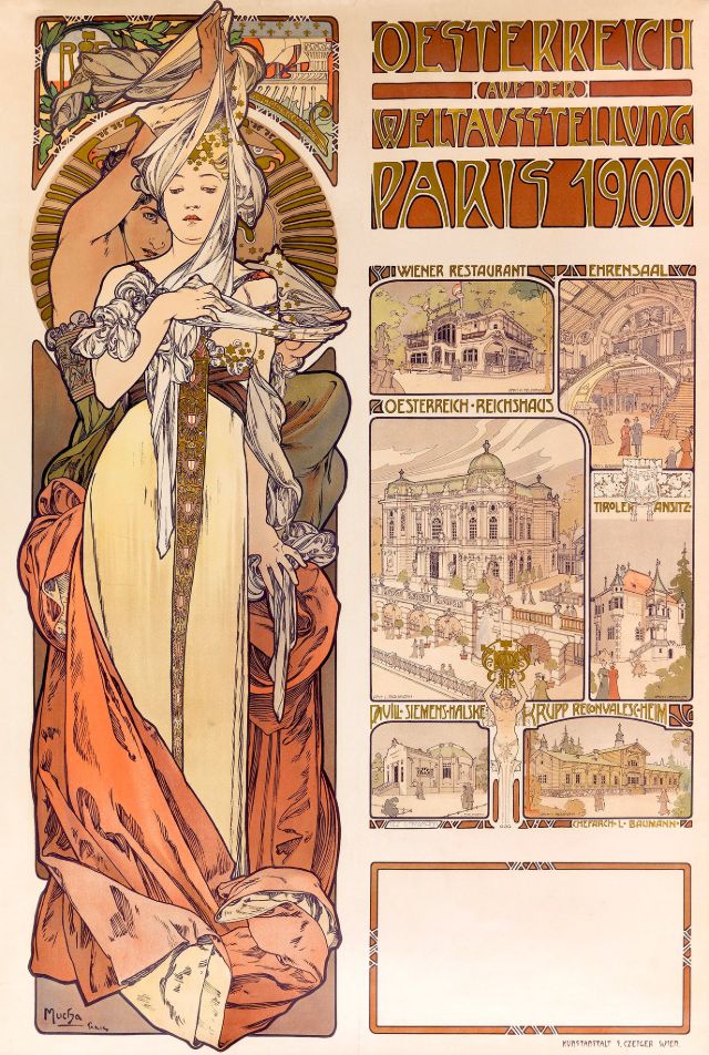 Альфонс Мария Муха. (1) Реклама папиросной бумаги Job (1896 г.) (2) Австрия на Всемирной выставке в Париже 1900 (1899 г.)
