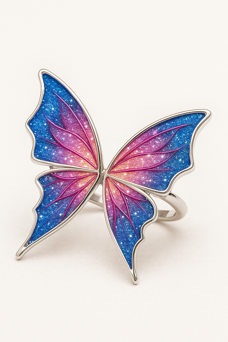 A luxury butterfly ring with iridescent wings in shades of magenta, violet, and blue. The wings have a gradient enamel finish with sparkling particles and silver edges. Photographed on a soft white background, studio lighting emphasizing the shine and fine jewelry craftsmanship.