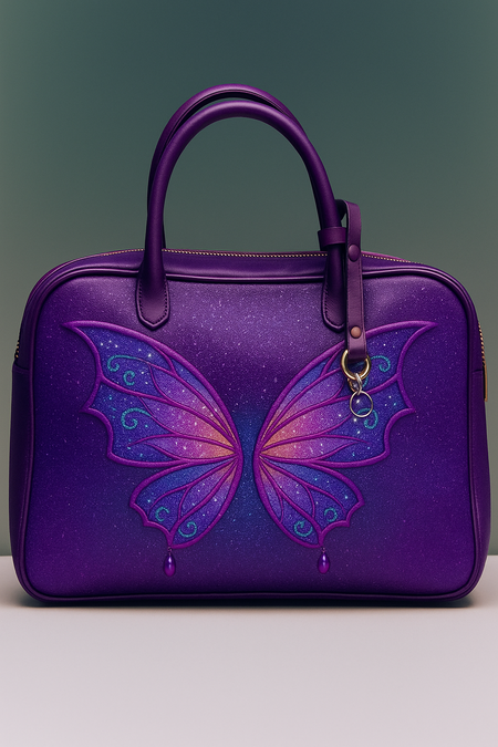 A designer handbag inspired by butterfly wings, crafted from glossy violet leather with a gradient from purple to magenta. The front panel features symmetrical wing motifs with glittering patterns in teal and pink. Gold hardware, structured silhouette similar to a Miu Miu bowling bag. Studio lighting, neutral background.