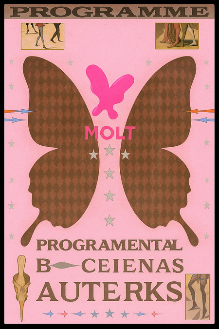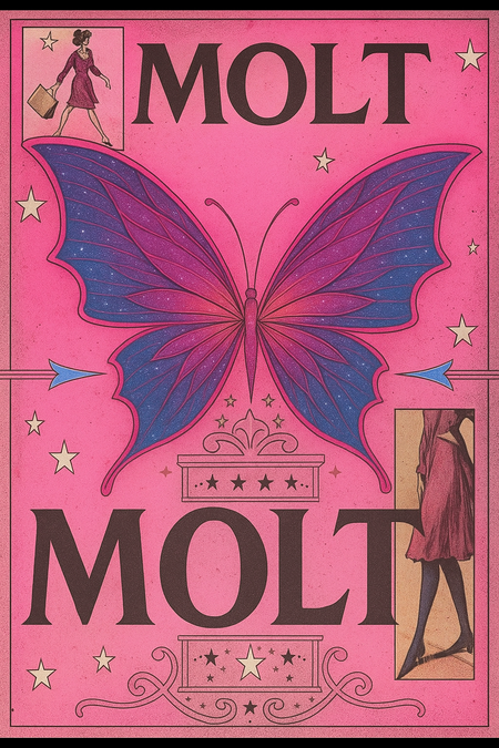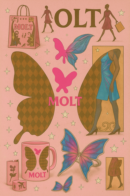 A surreal fashion event poster for the clothing brand MOLT, inspired by butterflies and transformation. Designed in a dreamy retro style with layered collage textures, pink tones, and subtle glitter accents. Replace dark abstract shapes with elegant butterfly wings featuring subtle diamond patterns. Include the MOLT logo and small typographic details in a sophisticated vintage layout reminiscent of avant-garde printed programmes.