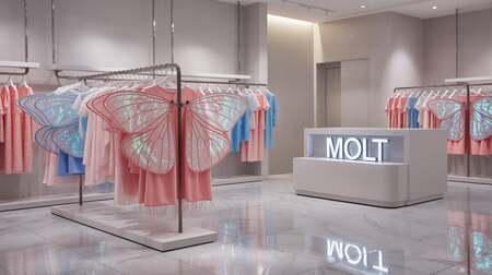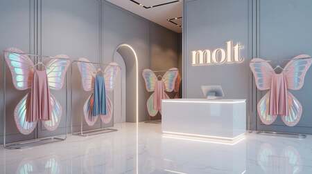 A modern clothing store interior with pristine white marble floors that reflect the soft lighting throughout the space. The walls are painted in elegant light grey, creating a minimalist backdrop for the unique merchandise displays featuring iridescent pink and blue garments that shimmer with delicate glitter accents. Each piece of clothing is designed to resemble butterfly wings, with flowing fabrics that catch the light and create ethereal, wing-like silhouettes on sleek chrome hangers and glass display cases. Near the polished white cashier counter, a stylish illuminated sign reads «MOLT» in modern sans-serif lettering, while soft ambient lighting enhances the magical, transformative atmosphere of the boutique.