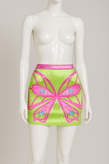 A lime-green satin mini skirt with a hot-pink and turquoise butterfly design on the front. The skirt is form-fitting, displayed on a mannequin against a neutral studio background. The material has a smooth, glossy finish with fine sparkly details inspired by Y2K fashion aesthetics.