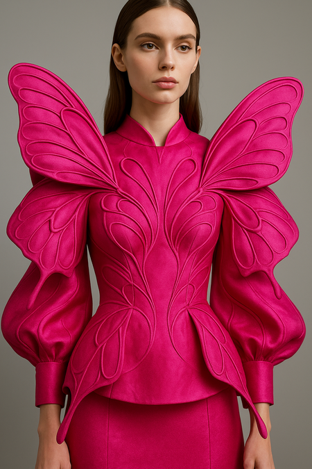 A high-fashion female blouse inspired by butterfly wings. The garment is bright pink with sculptural, voluminous shapes that resemble wings on the shoulders and chest. Made of satin or silk with couture-level construction, the design combines structure and fluidity. Studio lighting, minimalist background, focus on texture and craftsmanship.