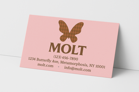 A stylish pink business card for the fashion brand MOLT, photographed on a white surface. The design features a brown harlequin-pattern butterfly above the brand name «MOLT» in elegant serif type, followed by contact details: phone number, address, website (molt.com), and email (info@molt.com ). The layout is simple and luxurious, evoking a refined, feminine, and artistic brand identity.