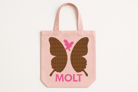 A light pink fabric tote bag lying flat on a white background, designed for the fashion brand MOLT. The front features a large symmetrical butterfly graphic with a subtle brown harlequin pattern and a small pink butterfly above it. Below the wings is the word «MOLT» in bold pink letters. The aesthetic is clean, minimalist, and vintage-inspired, blending soft femininity with a modern brand identity.