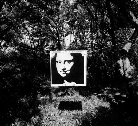 One might think that such photographs could also be easily created on the computer by simply mount- ing Mona Lisa into the respective landscape. In any case, Pusenkoff’s Mona Lisa might also have been a poster, which would at least have made the transport considerably easier. But no, it is a canvas on a stretcher, which not only complicates the transport but also the «glueing» when the action does not take place in an exhibition hall whose walls have special equipment for hanging pictures, or at least nails or hooks. As Pusenkoff demonstrates, the stretcher-frame can be carefully placed on the ground or fastened to the limb of a tree. One can stand it up on a row of bottles, fasten it with suction cups to the door of a limousine or give it to an elephant to hold. «Exhibiting» is variously transformed into «positioning», and it is always a question of an extremely fragile situation.
