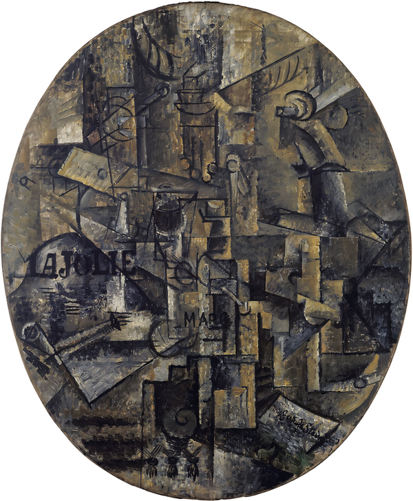 И есть еще один период развития — синтетический, который нужно знать для общего понимания всего анализа. Он идет сразу после аналитического с 1912 по 1914 год. В этот период художники возвращают цвет в картины и начинают объединять разные элементы в одной композиции, подчеркивать контуры и фактуру картины, а самое интересное — вклеивать куски газет, фольги и других материалов. Стали применять технику коллажей, которой дали название «папье-колле».