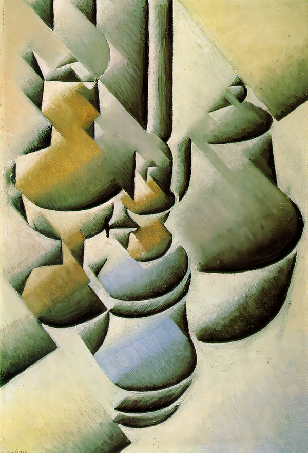 В отличие от работ, показанных выше, картина «Натюрморт с бутылкой ликера» имеет достаточно большое количество пересекающихся граней, и, поделенных на несколько частей, геометрических фигур. Благодаря этому создается эффект дробления, что затрудняет восприятие и распознание объектов на картине.