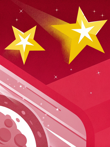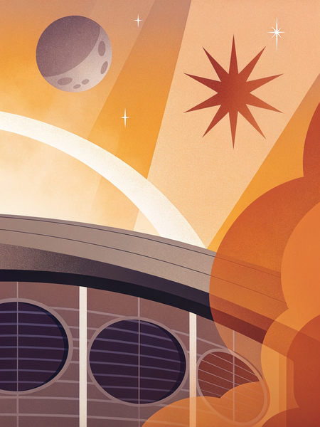 промпт/ 1960s vintage space age poster design style. A stylized illustration of an asteroid as a simple circular shape with subtle texture. Two bold, starburst suns in the background. Limited color palette of mustard yellow, red, rusty orange, and cream. Style: retro futuristic, mid-century modern design, grain, screen print texture. --style raw