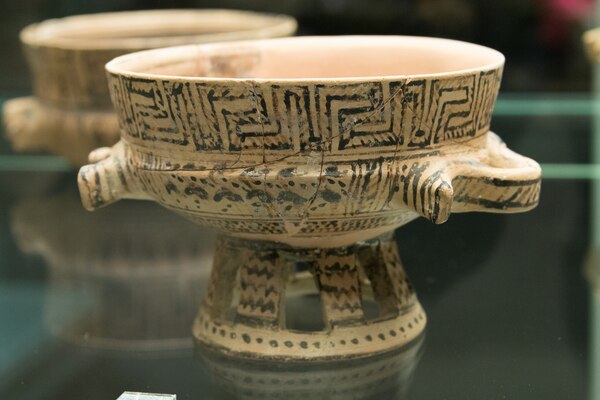 Геометрическая чаша, украшенная меандром, 730-720 гг. до н. э., керамика, дворец Кинских, Прага, Чехия. Древнегреческие извивы на колонны из руин храма Аполлона в Дидиме, Турция 300-150 гг. до н. э.
