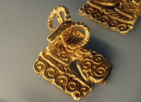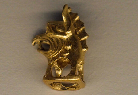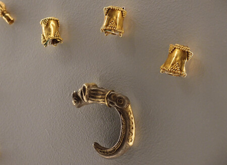 Экспонат выставки «Золото воинственных сарматов, 1.Золотые подвески и серебряный колчанный крюк, 2.Украшение для узды в виде головы грифона