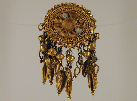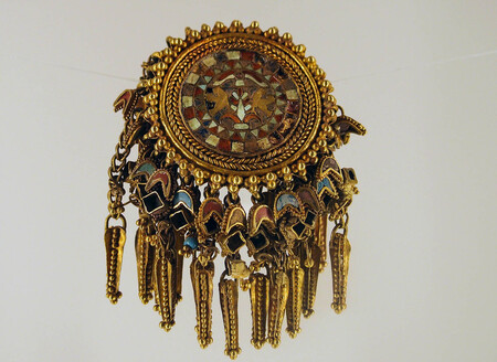 Экспонаты выставки «Золото воинственных сарматов». Медальоны, найденные в курганах, выполнены из золота, с инкрустацией стеклом, смальтой и минералами. Подвески изображают плоды с семенами