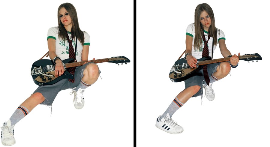 Слева: обложка альбома Under My Skin, 2004 г. Справа: Аврил Лавин, промо для альбома Under My Skin, фотограф Джеймс Р. Минчин III, 2004 г.