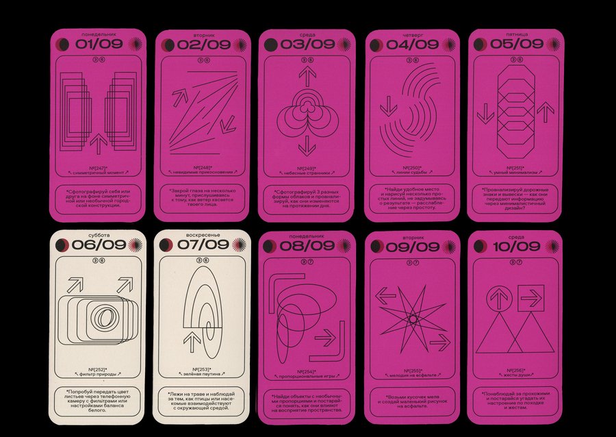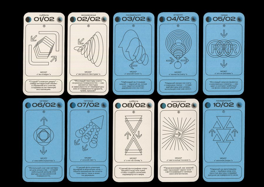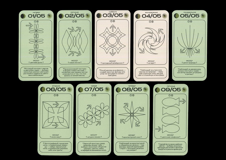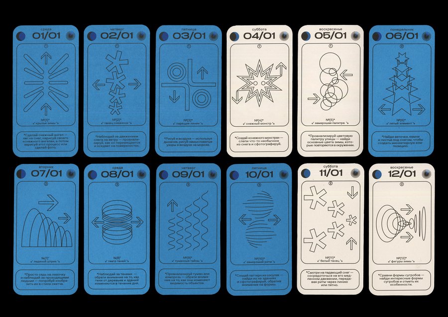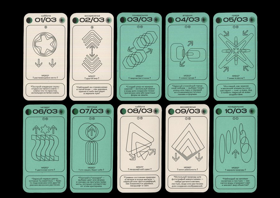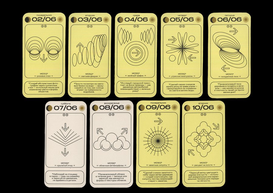 Каждая карточка календаря содержит в себе информацию о конкретной дате [день недели + число + месяц], данные о дне относительно года [порядковый номер в году + номер недели], а также фазы Луны и информацию о длительности солнечного дня. И, конечно же, само задание с названием! Каждый месяц имеет свой цвет будних дней, а выходные в каждом месяце белые.