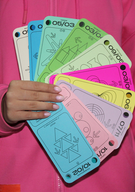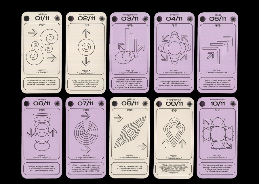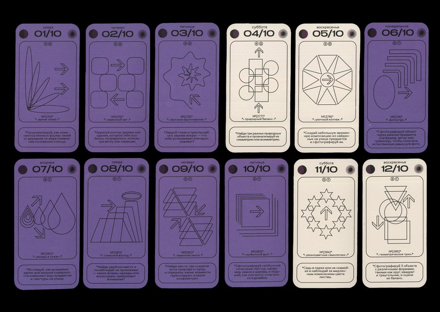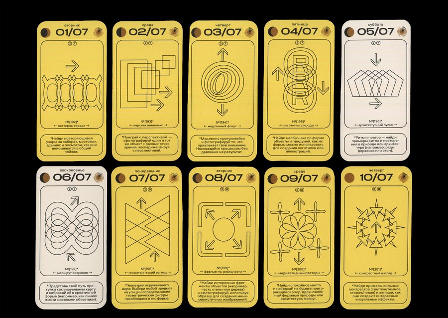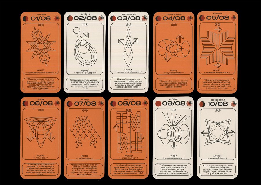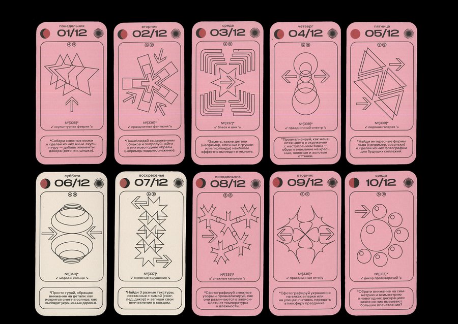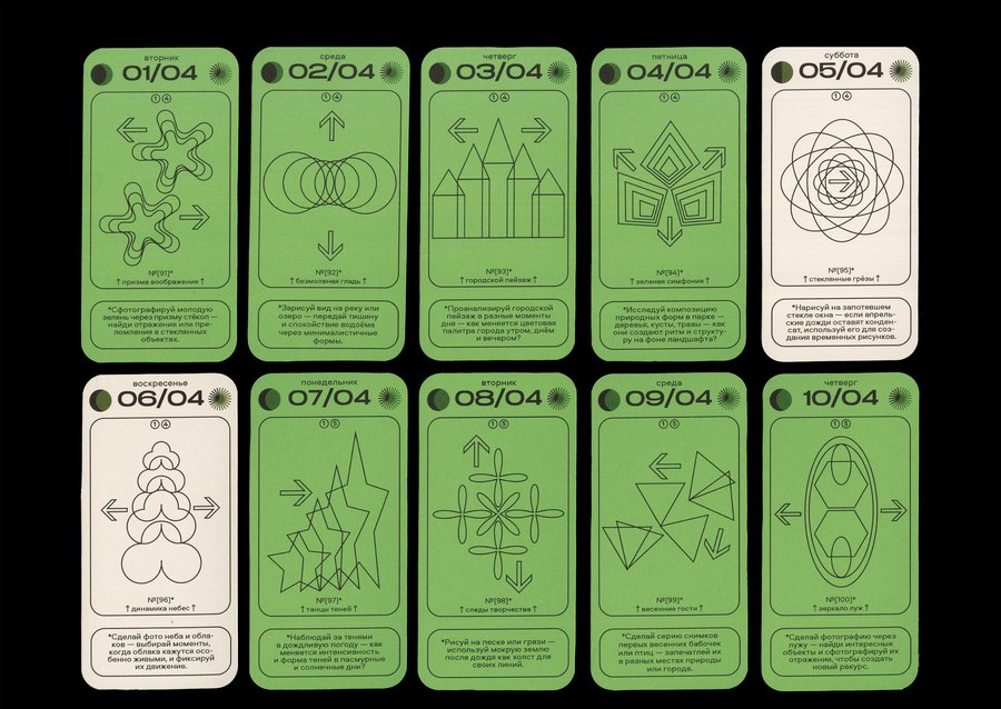 Каждая карточка календаря содержит в себе информацию о конкретной дате [день недели + число + месяц], данные о дне относительно года [порядковый номер в году + номер недели], а также фазы Луны и информацию о длительности солнечного дня. И, конечно же, само задание с названием! Каждый месяц имеет свой цвет будних дней, а выходные в каждом месяце белые.