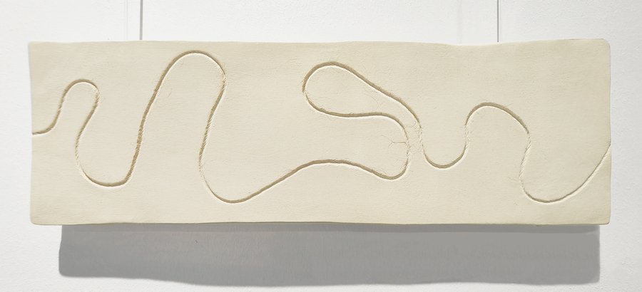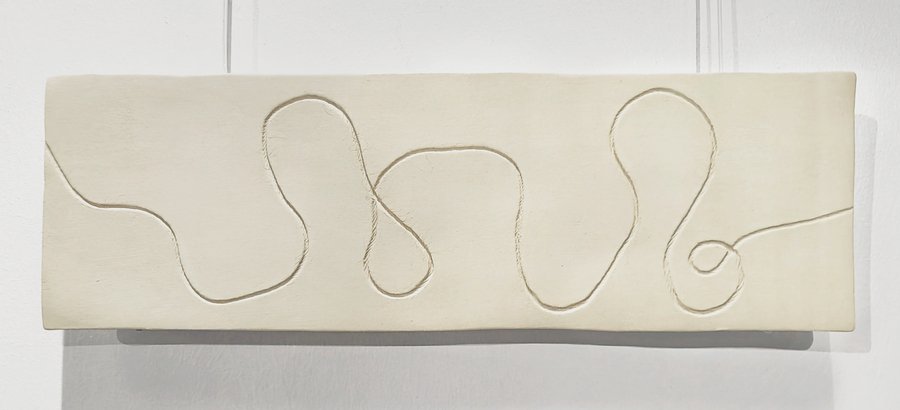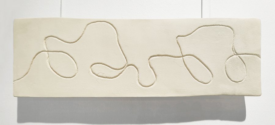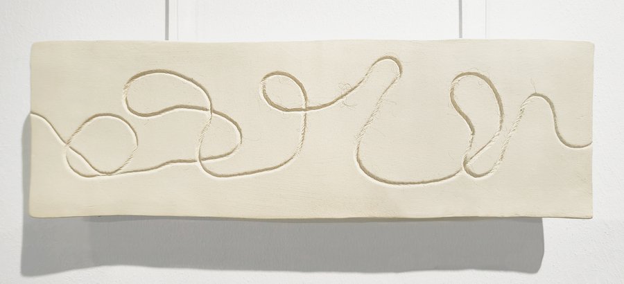 В серии керамических работ «Свободное падение» соединяется глина и нить. Идею о структурном хаусе невозможно избежать, работая с ручными техниками. Связывающиеся между собой нити — это система придания формы простому предсказуемому материалу. Но что если позволить нити самой выбрать форму, не помещая её в паттерн, а оставив отпечаток её произвольного падения на глине? Эта нить сохранит отпущенный контроль и отказ от перфекционизма. Она ляжет так, как изогнутся её волокна, и только на старте пальцы придерживают её конец, позволяя оставить след.