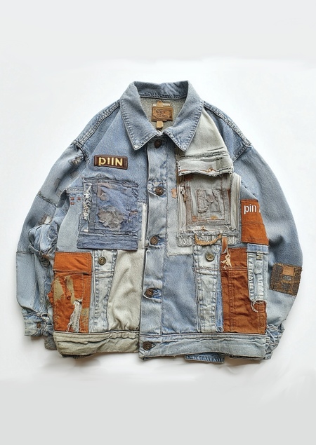 — Create a patchwork denim jacket for the brand «pin» using these references