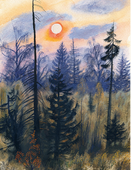 Колорит меняется, сумрак, холодеющая природа, только луна озаряет таинственный лес. «И на поляне волчьи очи Зеленым светятся огнем!"[1] Страшный, сырой и туманный бор — такой непрветливый он и на рисунках художника.
