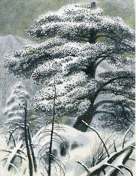«…Морозный светится пожар, Расцвет полярного сиянья…» [1] Разрушен терем росписной, в свои права вступила зима, серебро красок, тонкие ветви деревьев в инее. Николай Устинов как никто другой передал студеный холод зимней стужи.