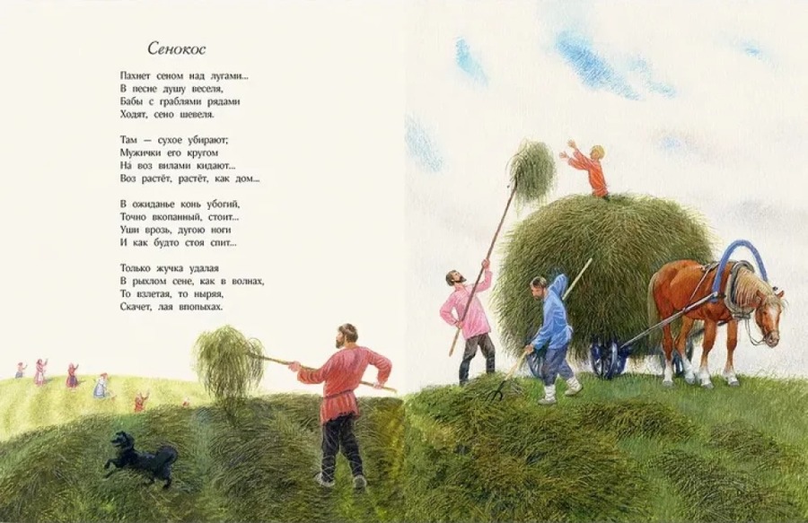 Крестьяне за уборкой сена на разворот — тоже многоплановый сюжет к стихотворению «Сенокос». «Пахнет сеном над лугами». [1] И, действительно, пахнет сеном при взгляде на искусный рисунок Николая Устинова.