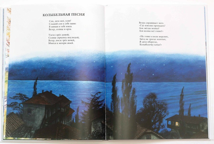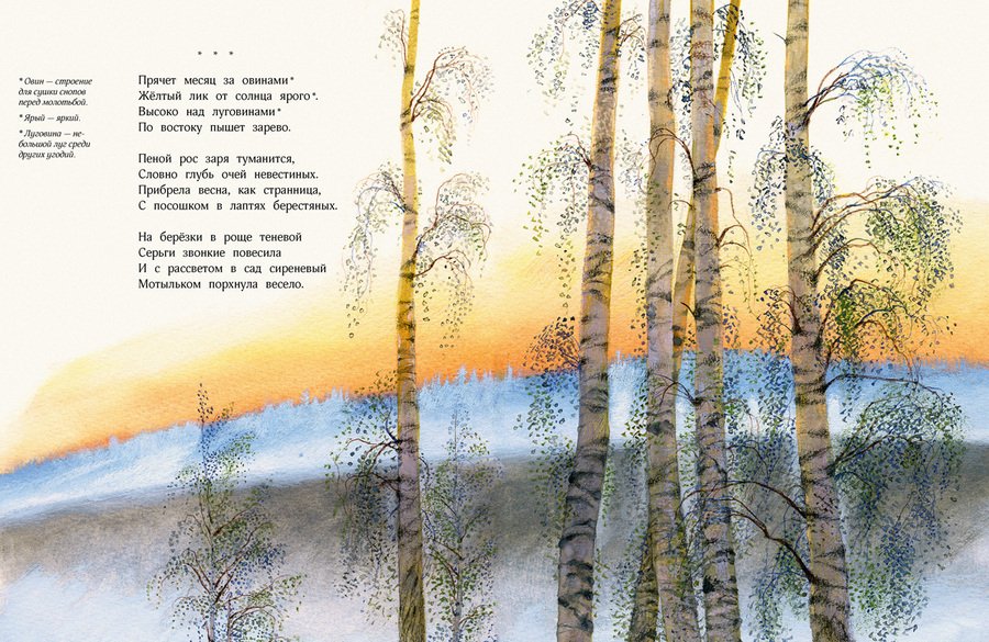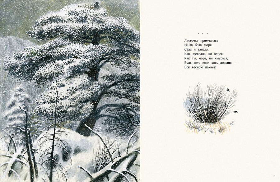 Весна с прозрачной водой, все дышит новизной природы, зеленый прозрачный пушок деревьев, россыпь первых одуванчиков на траве. Все именно так, как будто из детства смотрит на тебя иллюстрация к стихотворению Майкова «Весна». Разворот состоит из полосы текста и полностраничной иллюстрации. На полях рядом с текстом притаились весенние птицы, которых греет теплое радостное солнце.