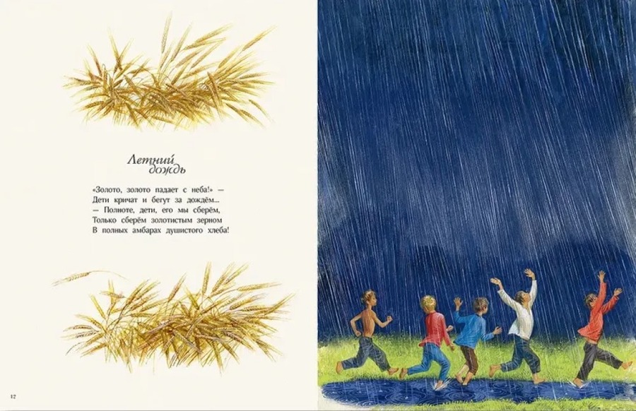 «Золото, золото падает с неба!» Стихотворение «Летний дождь» — всего пять строчек, но какие метафоры! Все как будто для художника и такого, как Николай Устинов. Бегущие радостные мальчики и россыпь колосков.