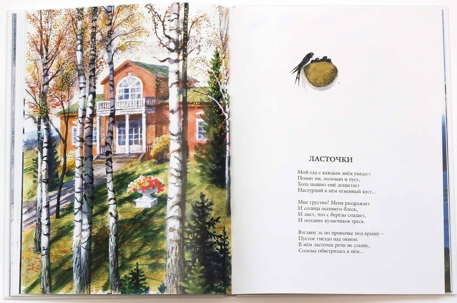 Старинная усадьба, увядающий сад, теплый колорит, прозрачный воздух, длинные тени — в иллюстрациях к стихотворению «Ласточки». Тишина и грусть по ушедшему лету, воспоминания о щебечущих ласточках: «О, если бы крылья и мне!» [1]
