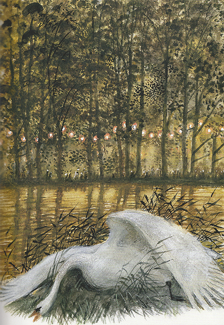Стихотворение «Лебедь». Раненый лебедь, мечтающий о небе в ночной тиши у тихого пруда, где-то там жиизнь, горят огни, но ему грезятся «родные стаи белых лебедей». Грустная песня, пустая надежда, что вот вот крылья зашумят, но только ветер пробирается сквозь камыш, печально шелестя листьями. И такой сюжет трогтельно изобразил художник.