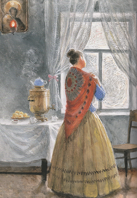 «Ах, когда-то, когда-то мой милый придет — отдохнуть на груди у меня…». [1] Тоска и ожидание одинокой женщины в глухой деревне, звук колокольчика и кибитка в снежной ночи. Все это в иллюстрациях к стихотворению «Колокольчик».