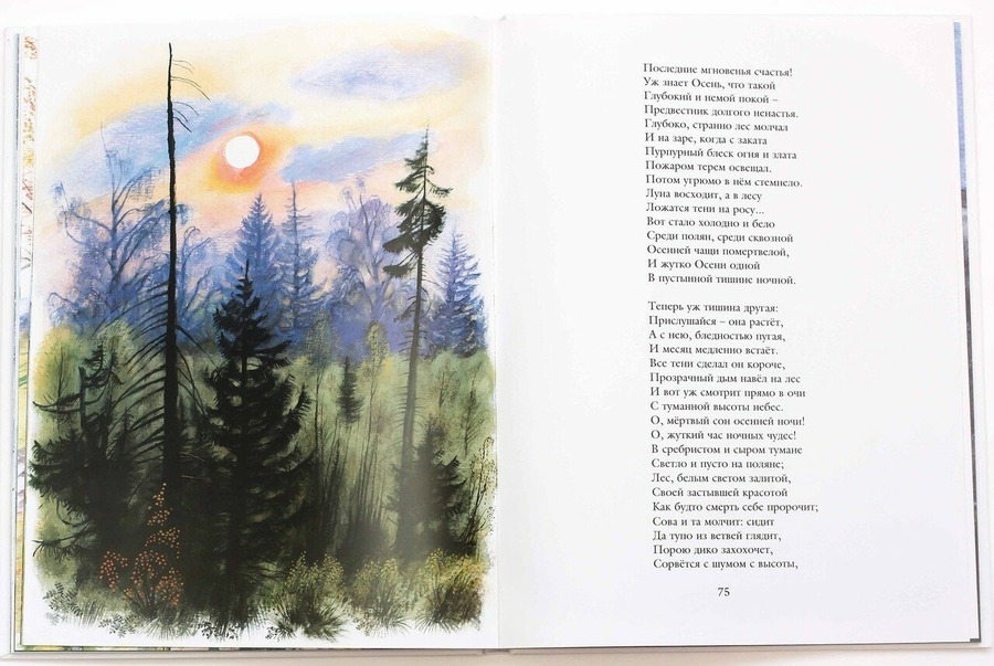 Подернутый позолотой лес, убранный луг, прозрачный воздух, гоубая лазурь, темнеющие ели — красота в строках поэмы «Листопад». Так и изобразил картину первых осенних дней Николай Устинов. «…Потом угрюмо в нем стемнело. Луна восходит, а в лесу Ложатся тени на росу…» [1]