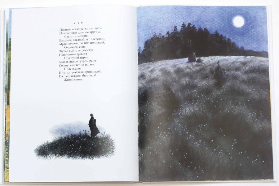 Простор и даль, многоплановый сюжет на страницах, иллюстрирующих стихотворение «Летний вечер». Всадник на колне мчится по дороге навстречу ночи и луне.