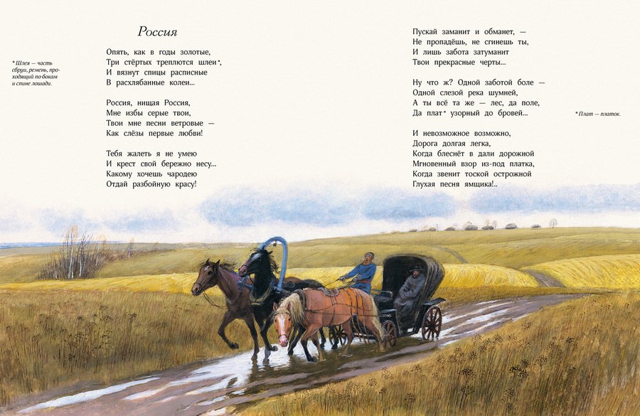 «…Россия, нищая Россия, Мне избы серые твои, Твои мне песни ветровые — Как слезы первые любви!…» [1]
