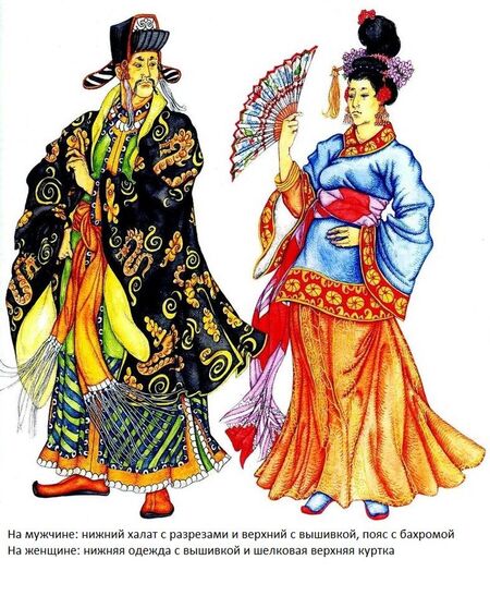 В историческом обществе одежда играла важную роль в определении социального статуса и профессии человека. Дворяне и аристократия носили роскошные длинные шелковые халаты с богатой вышивкой, украшенные драгоценными камнями и металлом, что подчеркивало их высшее положение. Их наряды отличались символическими узорами, указывающими на родословную и принадлежность к элите, а яркие насыщенные цвета — красный, синий, пурпурный — демонстрировали богатство и власть.