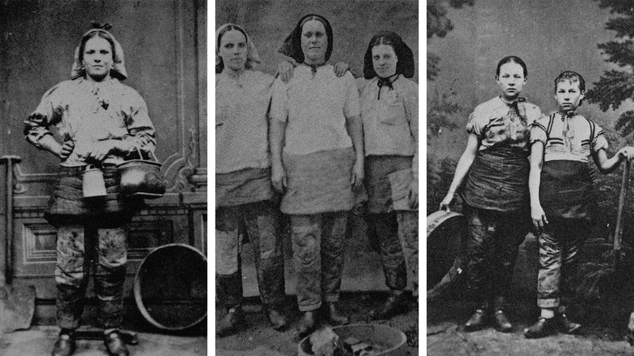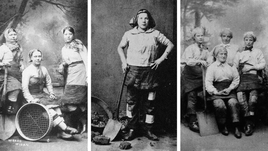 Девушки из шахты Уиган, Англия, XIX в. Несмотря на запрет женщинам и девочкам работать в шахте (1842 г.) вдовы шахтёров и их дочери продолжили работу. Носили плотные штаны и юбки. [18]