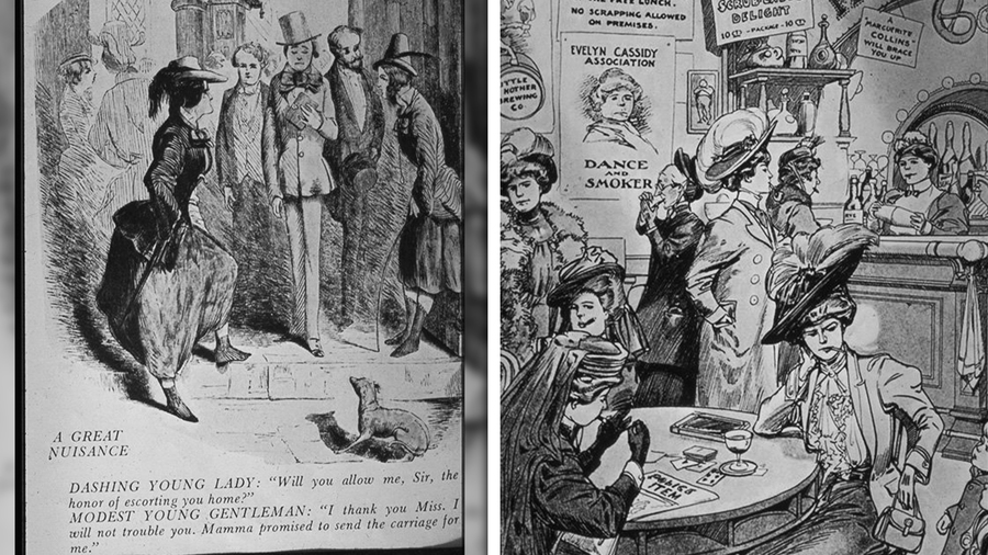 Рис. 1, 2: карикатуры на женщин в блумерах [7]; Рис. 3: карикатура на суфражисток [8]. Авторы неизвестны