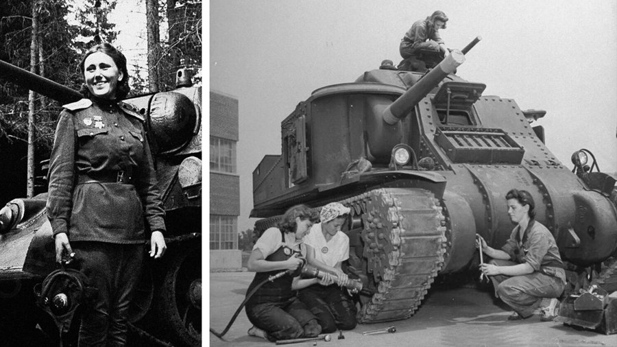 Фото 1: Самусенко А.Г., командующая танковым взводом СССР[59]; фото 2: Миссури, США, 5 июля 1942 г.[60]; фото 3: Наоми Паркер Фрэйли у станка[61], предп. прообраз плаката Миллера «We Can Do It!"[62]