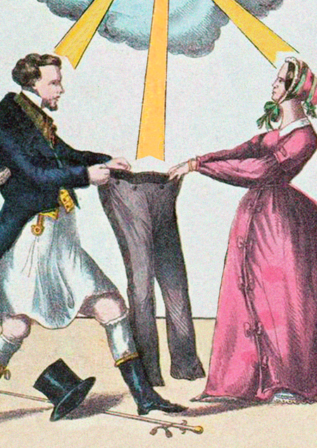 Карикатура «Девушка в шароварах просит отца своего жениха дать ей согласие на брак», Вырезка из газеты, предположительно 1852 год [28]