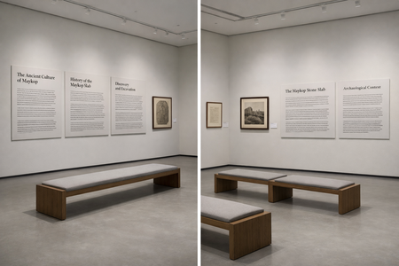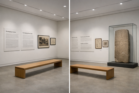 2 зал — Попытка, где собраны исследования Руслана Даура и его реконструкции, раскрывающие поиски и гипотезы о мифоэпической письменности.