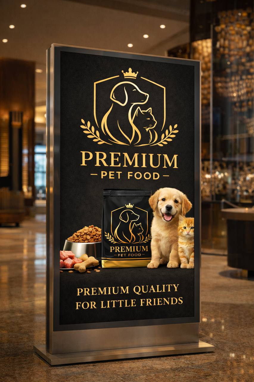 Для начала был сгенерирован логотип по промпту «Сгенерируй минималистичный логотип премиального бренда натурального корма для животных» (для определения основных цветов и создания единого стиля, отталкиваясь от лого). Далее логотип был загружен в нейросеть с промптами «Это логотип премиального бренда корма для животных. сделай упаковку корма с подписью „for cats“ тем же шрифтом что на референсе. сохрани основные цвета но адаптируй дизайн под упаковку, измени рисунок», «Теперь сделай упаковку корма с подписью „for dogs“ тем же шрифтом что на референсе. сохрани основные цвета но адаптируй дизайн под упаковку, измени рисунок», благодаря чему получились упаковки корма. Также на основе лого было сгенерировано пространство («Сгенерируй интерьер магазина в котором будут продаваться эти упаковки корма. пусть на переднем плане будет 3 упаковки. сохрани основные цвета бренда, сделай пространство премиальным и современным»), промо-материалы («Это логотип премиального бренда корма для животных. создай рекламную афишу, измени рисунок, но сохрани основные цвета и шрифт референса. сделай подпись „premium quality for little friends“ и „Это логотип премиального бренда корма. сделай баннер для интернет рекламы, измени рисунок, но сохрани цвета и шрифт. сделай кнопку „buy“), их размещение („Помести этот постер на стену современного стеклянного билборда“ и „Помести эту рекламу в качестве интернет баннера на ноутбук“), носители („Это логотип премиального бренда кормов для животных. сохрани основные цвета, убери текст под лого и адаптируй дизайн под формат бумажного пакета с ручками“, „Это логотип премиального бренда кормов для животных. сохрани основные цвета, убери текст под лого и адаптируй дизайн под формат визитки, сделай новый рисунок. создай стопку таких визиток. на них должно быть написано „contact us“, „Это логотип премиального бренда кормов для животных. сохрани основные цвета, убери текст под лого и адаптируй дизайн под формат миски для корма, сделай новый рисунок, на нем не должно быть повторения лого, собак и кошек. Можно использовать корону или золотую окантовку“)